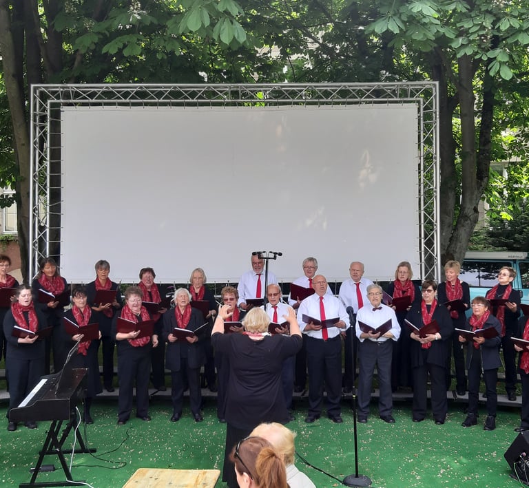 Mit höheren Außentemperauren war der Garten der Chorleiterin, später der angemietete Saal im Bürgerhaus unsere Probenstätte.